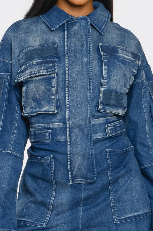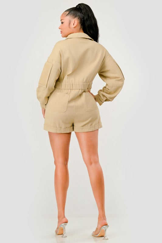 This structured romper channels commanding confidence with its utility design and sharp tailoring. Featuring flap pockets, tonal Velcro accents, and a cinched waist belt, it offers a bold yet refined silhouette perfect for elevated streetwear moments. The neutral beige tone pairs effortlessly with both day and night styling, while its soft but structured cotton blend keeps the look polished and powerful. A wardrobe essential for the woman who leads with style.